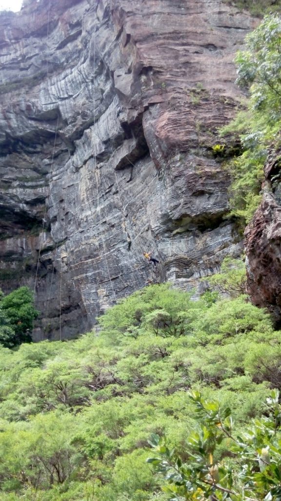 However, we did spot the traditional climbdown from afar - a blue rope is not quite visible in the ferny gully .